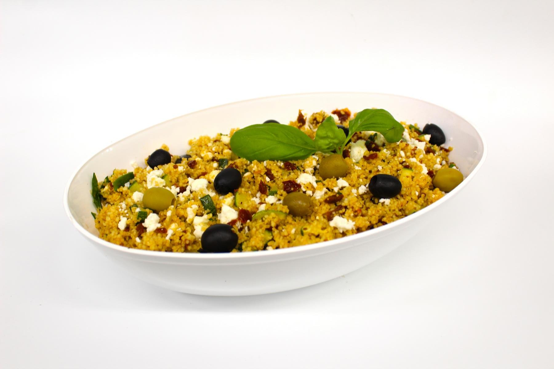Kuskus s pečenou cuketou, sušenými rajčaty, špenátem, bazalkou a olivami, zdobený balkánským sýrem 1,7